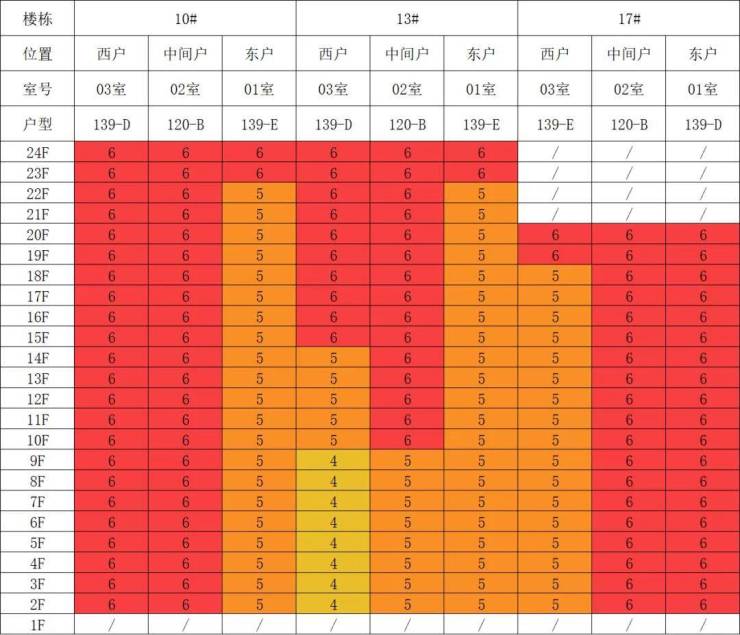 17号楼采光优异几乎不存在遮挡,10号楼低层受遮挡,13号楼中低层受遮挡。就具体遮挡时间而言,10号楼主要在傍晚受7号楼遮挡,13号楼主要在下午受14号楼遮挡。