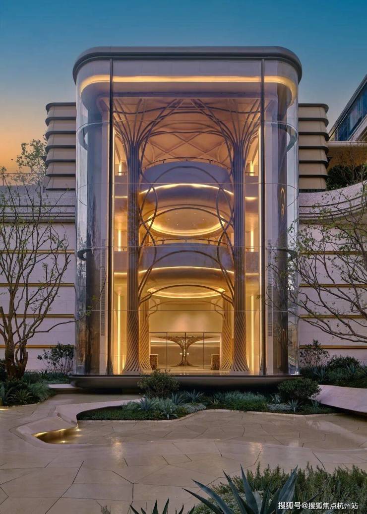 因项目整体抬高,从下沉庭院到架空层“空中花园”的落差极大,形成独特的峡谷地貌,杭序府的设计团队汲取九溪烟树为造园灵感,打造一个立体多维的城市溪谷交互园林;因项目毗邻江岸,杭序府的外立面以“站立的江潮”为灵感,
