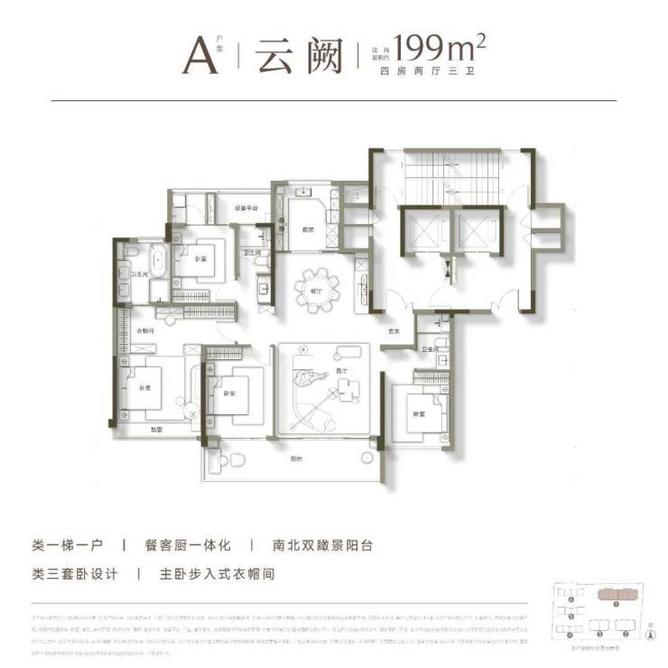 高层均为建面约199㎡的大平层户型,极致纯粹的业主圈层,带来更为尊贵的居住体验。其户型设计尽可能扩宽南向开间的同时,展现出了极为阔绰的空间尺度,足以满足多代同堂的居住需求,成为众多购房家庭终极改善的首选。