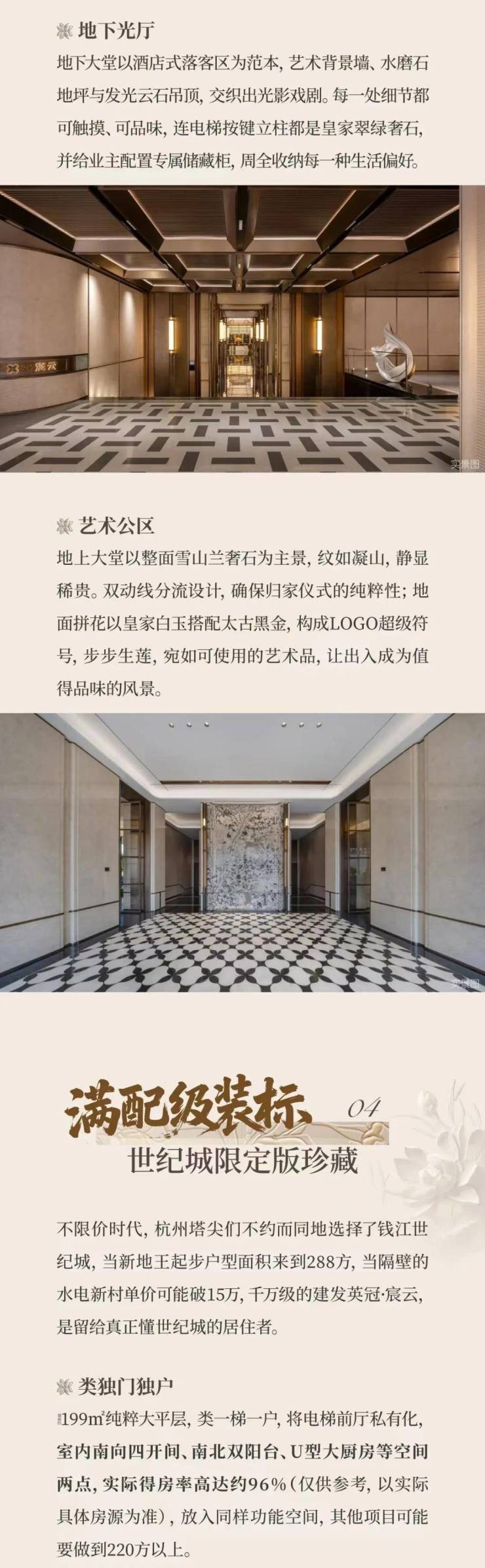 采用“王府中式”设计,大门为歇山顶形制(宽53米、高近11米),配黄铜狮、罗汉松及蓝翡翠奢石。园林融入西湖十景元素,如“花港观鱼”水景、“柳浪闻莺”绿植,并设雾森系统首层单元门厅石材铺就,肌理沉稳。