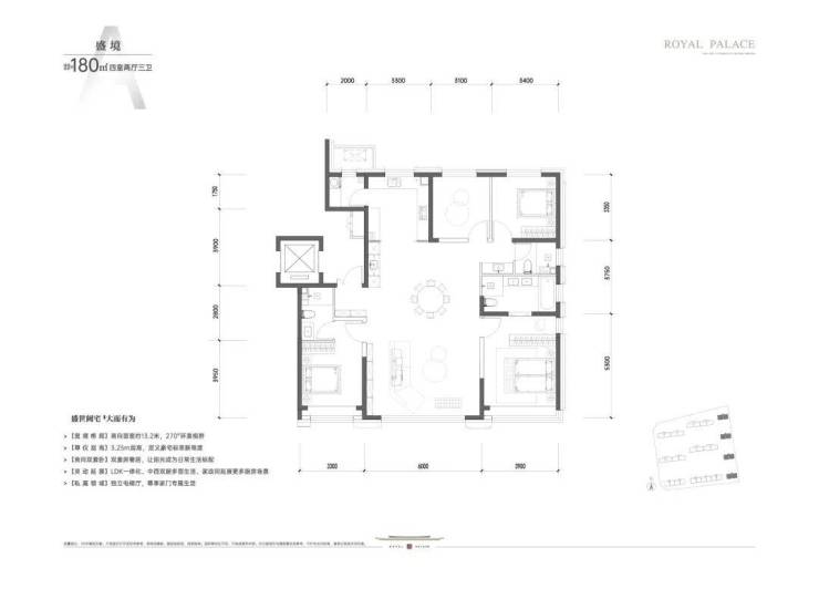 180㎡四居:整体户型格局很规整,没有缺角,风水很好,南向三面宽设计,客厅面宽达到了6米,餐客一体设计,使整个活动空间更加宽阔。