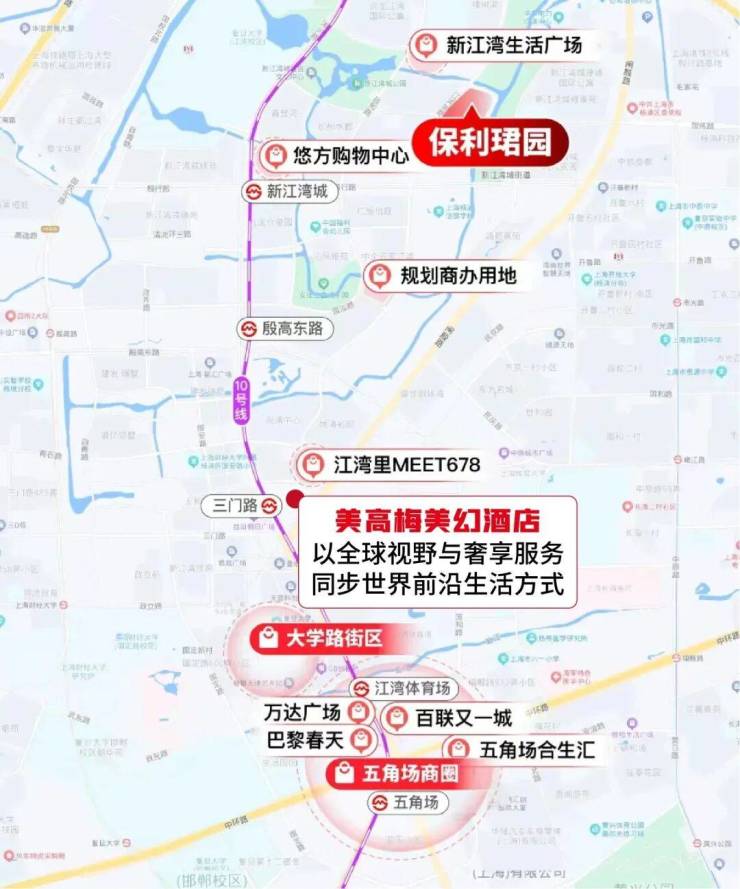 ① 繁华商业:周边环绕江湾里MEET678、五角场商圈、大学路等五大商圈,已官宣入驻的美高梅美幻酒店将同步世界前沿生活