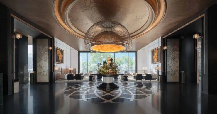 入户大堂更是对标悉尼嘉佩乐酒店,约250㎡阔绰空间,奢石接待台、水刀拼花地面、非遗苏绣屏风,处处彰显豪宅质感。暖调空间搭配精致工艺,满满的归家尊崇感。