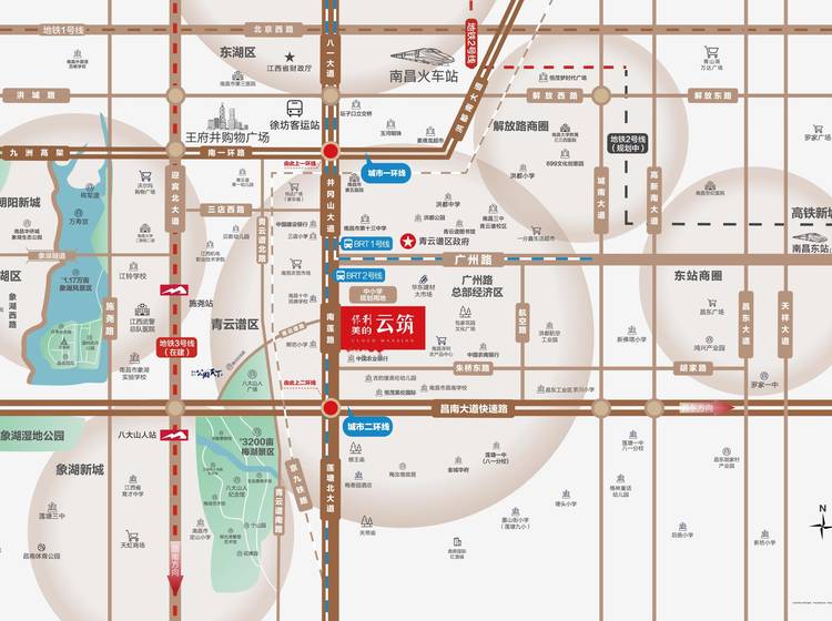 沃尔玛、王府井、家乐福、华东建材大市场、民德学校、熊坊小学、吉的堡英伦幼儿园、南昌市昌南学校、南昌市第五医院、江西省皮肤病专科医院、八大山人梅湖景区、象湖公园、包家花园文化广场