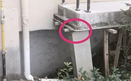 验房师还比较惊讶的是,小区20栋的某一层的横梁,外围看已出现变形,23栋一楼外扩平台下的水泥支柱也出现很大程度的歪斜。