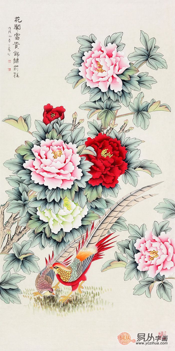 本作品是王一容老师力作,以牡丹、锦鸡为描写对象,采用工笔画法绘制而成。牡丹是我国的国画,花开时朵大色艳,姿丰典雅,奇丽无比,花香袭人。牡丹花不仅观赏性强,还是吉祥富贵的象征,是绘画作品中常见的描绘意象。两只锦鸡相伴而立于石头之上,一只锦鸡正在愉快的吟唱。旁边的牡丹花悄然开放,花朵艳丽花香怡人。作品中锦鸡配花卉寓意锦上添花、前程锦绣等吉祥意思。