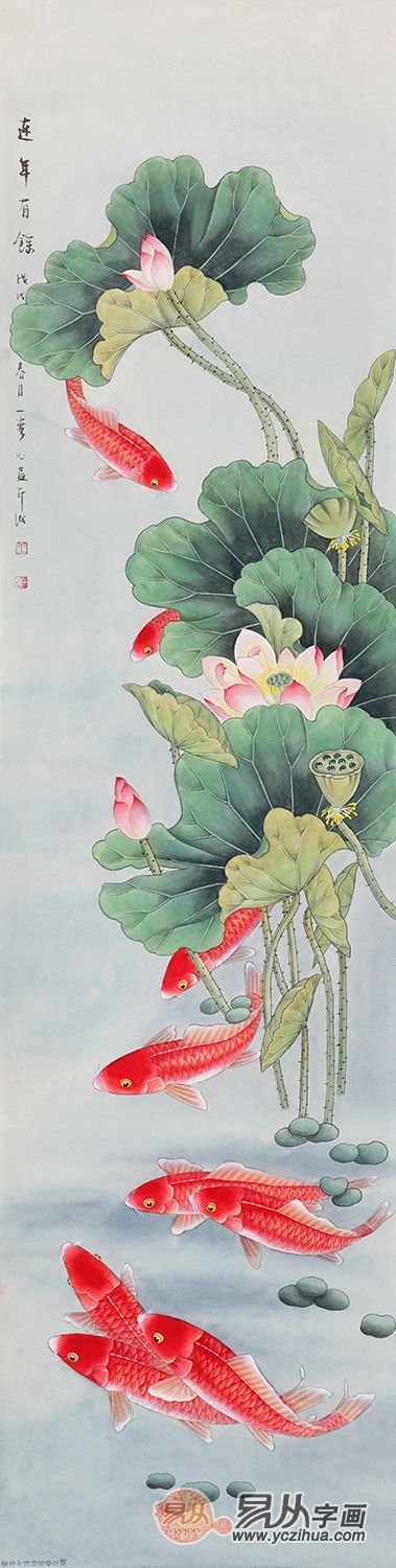 九鱼图,顾名思义,在画中的九条可爱的鲤鱼在水中嬉戏,各具神态。红色的鱼有旺运之说,“鲤”音同“利”,预示着可旺运聚财。“九”有长长久久、经久不衰的意思,而“鱼”取“余”的含义,两者合起来就是“年年有余”的美好祝福。鲤鱼与荷花两种题材结合,不仅可以赞美主人高洁品格,也代表着对未来美好生活的憧憬。