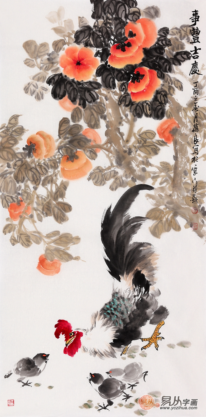 晋葆良新品佳作公鸡柿子图《事丰吉庆》