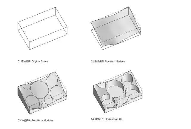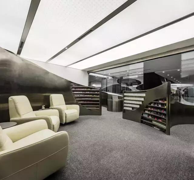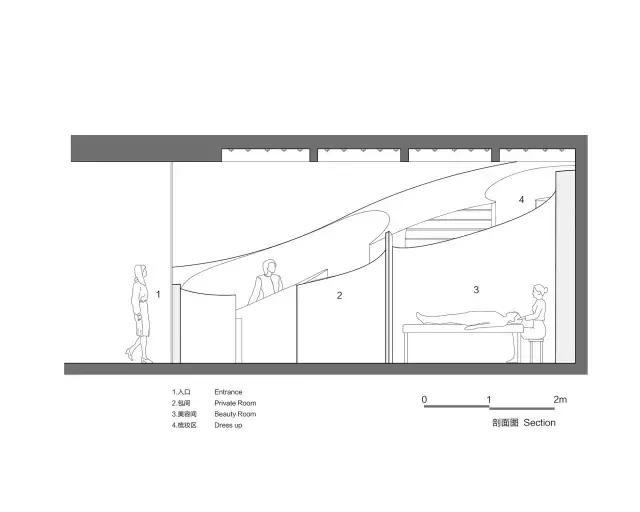 山丘之中划分出七个大小不一的“山洞”。山洞们根据人的行为与视线关系,或显或藏,相互分隔又相互连通,构成不同尺度的美甲、美容区域。美甲区以两个或三个座位为一组,美容间则可相对封闭以保证隐私。山洞之间的部分用作库房、服务间、展架等。