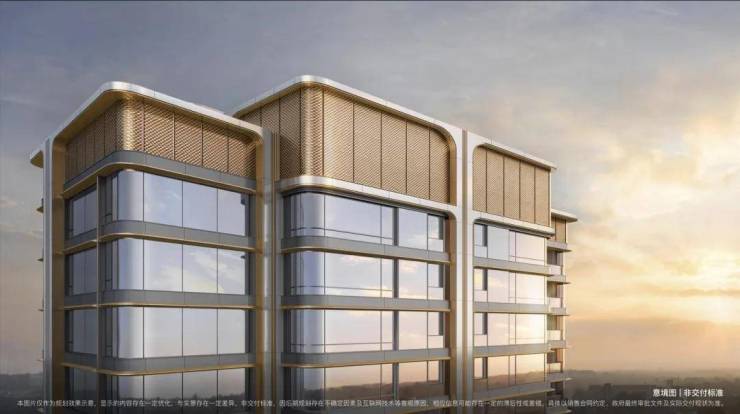 外立面采用全玻璃+铝板幕墙体系,以高级灰和金色进行色彩搭配,外立面都有圆弧玻璃及圆弧铝板设计,用料及造型成本高,增加了外立面的高级感。