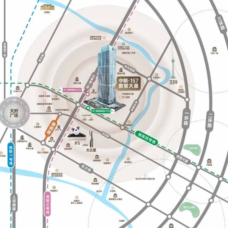 占据城市中轴绝佳区位,坐拥春熙路-太古里核心商圈稀缺地段,东望「成都339地标」,西接「天府广场核心商务区」,北临「文殊院历史文化商圈」,三大核心商圈环绕,汇聚一城商业、文化、商务精华,地段不可复制,执掌城市财富动脉,为企业发展奠定核心优势。