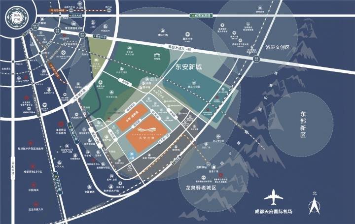 5500亩东安湖生态公园、约1910亩驿马河公园、约32平方公里锦绣天府、全国最大城市森林公园龙泉山森林公园、东安阁酒店、木棉花酒店、图书馆、大剧院、新闻中心等配套环伺;项目占据东安湖中央活力区CAZ核芯位置,项目一线瞰湖高阶产品,引领区域高端商业和楼宇总部发展