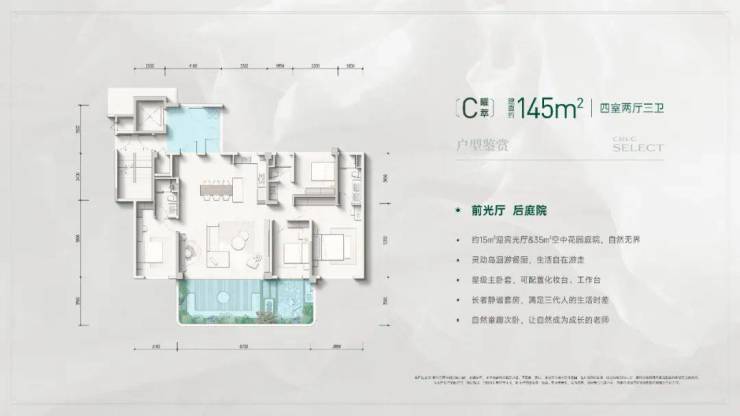 这一点其实在建面约145㎡的户型中,也有体现。该面积段的户型共有3种布局,不同之处在于空中花园阳台分别位于户型的西侧、南侧和北侧。