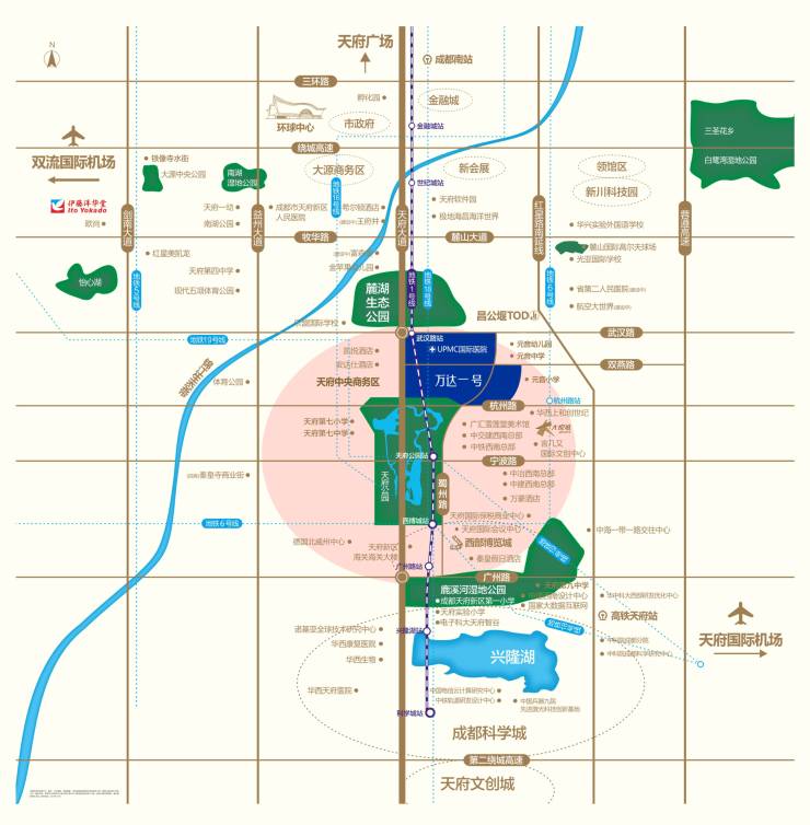 【健康优势】引入成都万达UPMC国际医院,紧邻华西天府医院(已开业)、四川省第二人民医院天府分院(肿瘤诊疗中心)、省妇幼保健院天府院区、以及规划中的华西牙科医院、华西康复医院等。