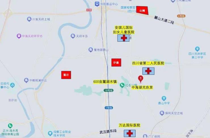 医疗方面,项目周边最近的就是四川省第二人民医院、万达国际医院和天府新区安琪儿国际妇女儿童医院,此外还有天府华西医院。