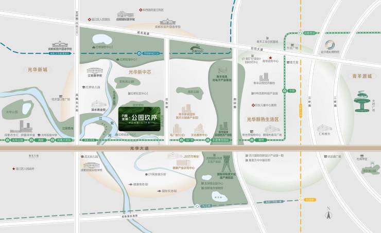 沿光华大道贵脉,形成城西黄金主轴发展,在主轴两侧强劲吸附重要资源配套。