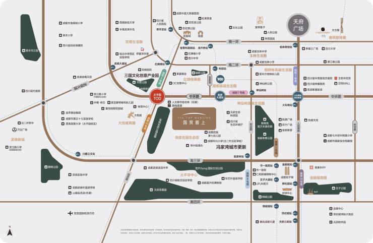 以项目为圆心,成都三大城市级商圈——IFS—太古里—春熙路商圈、新南商圈以及金融城商圈,还有五大区域级商圈——红牌楼商圈、大悦城商圈、玉林生活圈、双楠生活圈、磨子桥商圈。