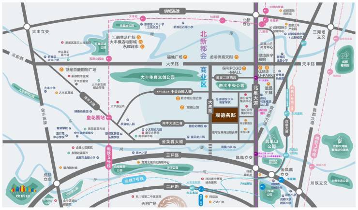 交通:地铁5号线皇花园站;三横三纵的立体交通网络,三横是三环路、大天路和绕城高速;三纵是金丰高架、北星大道(天府大道北沿线)和金芙蓉大道,一步主城,畅连全城;