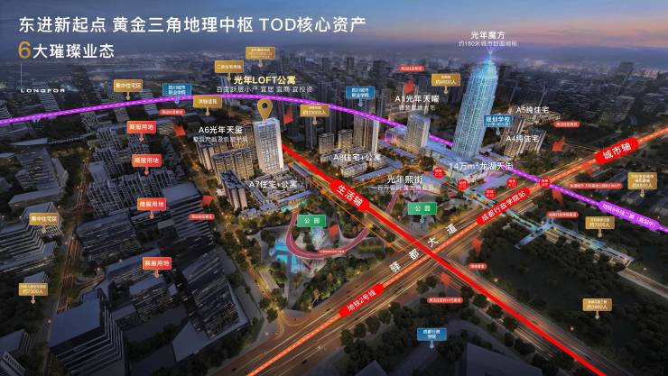 交通中心:三轨:2号线和9 号线(规划中)和30号线交汇,实现全城高效互动,三横:东大街,成龙大道、厦蓉高速;三纵:锦江大道、三环路、第一绕城