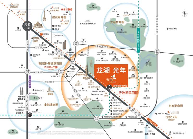 交通中心:三轨:2号线和9 号线(规划中)和30号线交汇,实现全城高效互动,三横:东大街,成龙大道、厦蓉高速;三纵:锦江大道、三环路、第一绕城