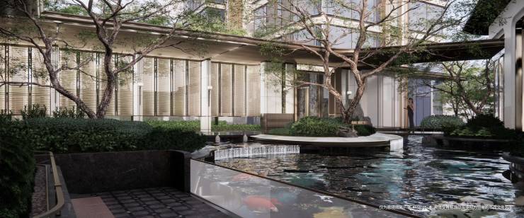 以进口锦鲤为核心打造动态水景,通过鱼群的色彩与灵动性激活水体空间营造“鱼乐人欢”的互动场景。
