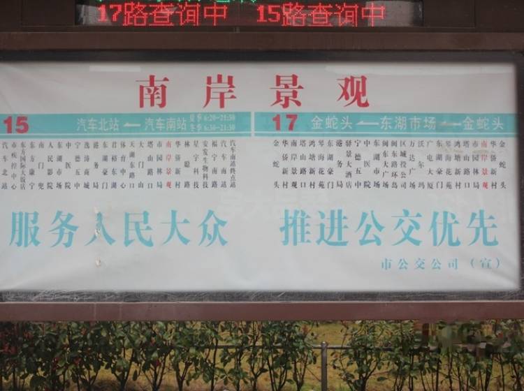 唐程御品(公交站):17路;华侨新村(公交站):15路;南岸景观(公交站):15路;17路;林聪路(公交站):15路;星宇科技(公交站):15路;市园林局(公交站):15路;17路;南湖滨路口(公交站):7路;金蛇头(公交站):17路;东晟泰怡园(公交站):7路;塔山路口(公交站):15路;17路;