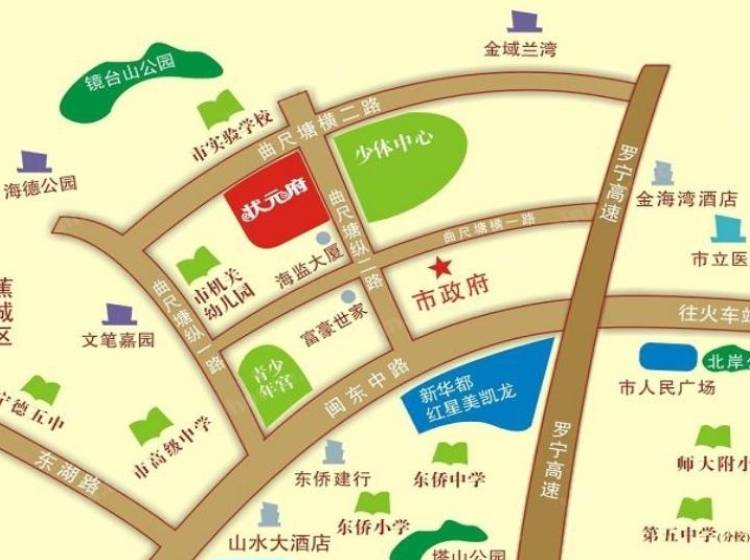 周边配套: 西邻机关幼儿园和青少年宫,北邻东侨实验学校(有小学、初中、高中部,一条路教育),东邻少体中心,东南为市政府大楼,南邻海洋检测中心,环境优美、雅静,是宁德新政务中心的风水宝地 福瑞·状元府南向300米内的联信广场,有新华都、红星美凯龙等大商场超市入驻,商业生活配套应有尽有。沿闽东路东行几分钟就可到达崭新的甲级市立医院、市人民广场和北岸公园。沿闽东路南行数分钟直达沃尔玛、万达广场。 周边商业: 福瑞·状元府南向300米内的联信广场,有新华都、红星美凯龙等大商场超市入驻,商业生活配套应有尽有。沿闽东路南行数分钟直达沃尔玛、万达广场。 周边景观: 人民广场,北岸景观,镜台山麓 周边公园: 市人民广场和北岸公园。 周边医院: 沿闽东路东行几分钟就可到达崭新的甲级市立医院 周边学校: 西邻机关幼儿园和青少年宫,北邻东侨实验学校(有小学、初中、高中部,一条路教育),东邻少体中心