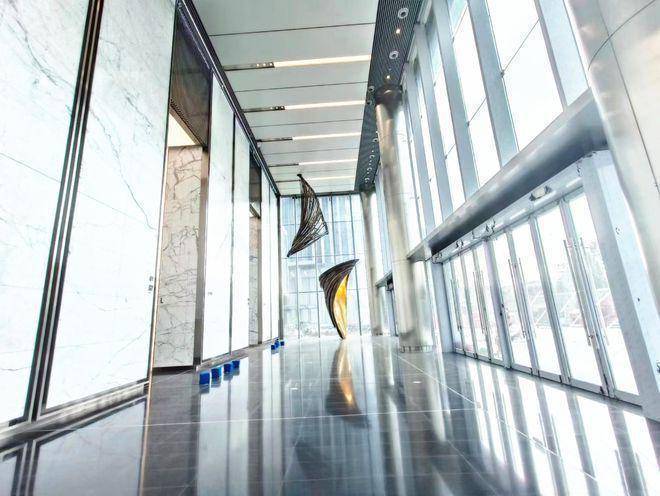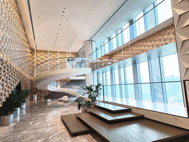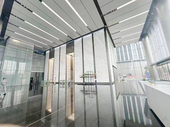 首层大堂:首层主大堂三层挑高,约13.8米,地面铺设大理石,配以铝板及不锈钢天花