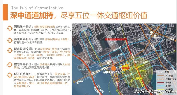 ①、国际航空枢纽:深圳宝安国际机场(现有T3航站楼,规划新增T4航站楼(在建)、机场第三跑道),多条航线直飞全球120个城市,链接全球资源。