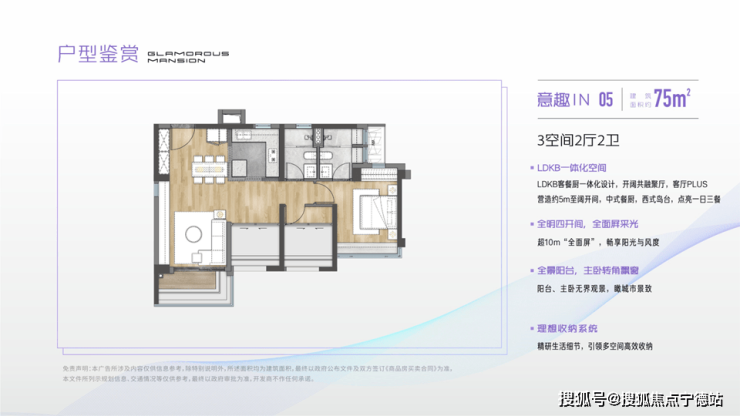 ①、出售面积:75平米3房2卫2厅,总价439万起