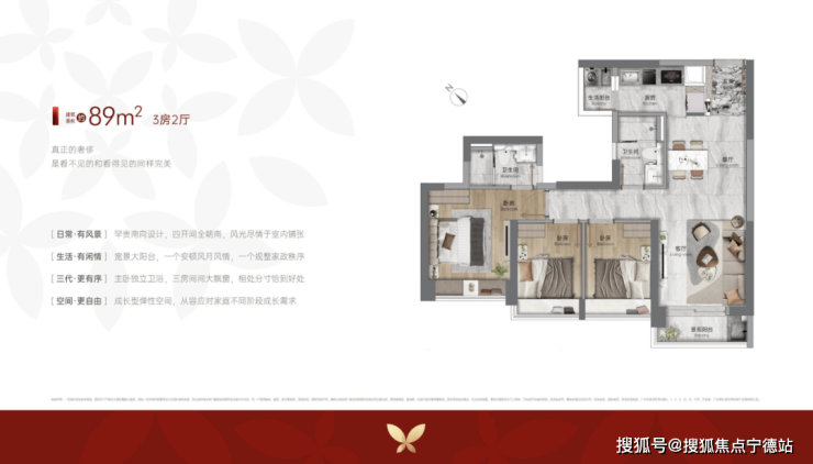 ②、出售面积:89平米3房2卫2厅,总价299万起