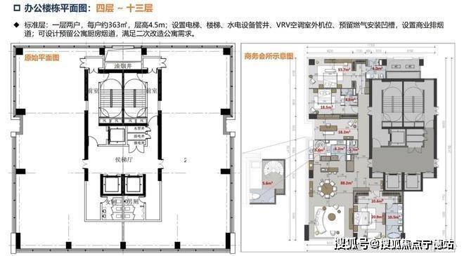 大平层公寓式设计,每层配备有厨房通风、卫生间给排水、燃气等加装条件,可商办,可居住,可会所接待等多种使用场景功能随心设计