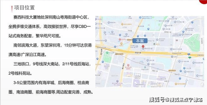 项目位于深圳市南山区高新技术园南区,东面为三诺智慧大厦,西面为腾讯滨海大厦,南侧为滨海大道,北侧为深圳市软件产业基地,片区汇聚了以腾讯、百度、航天、联想等为代表的大批创新企业总部。