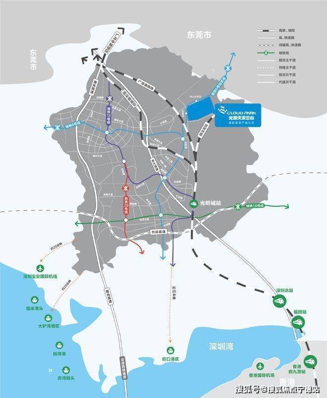 光明区以高铁枢纽、地铁、高速为依托,连接深圳、香港、广州、东莞等周边城市,形成30分钟大湾区核心城市交通圈。