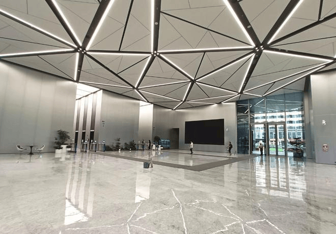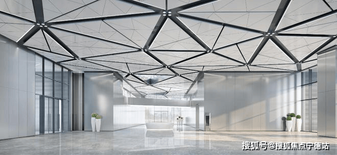 大堂设计:顶部预设展览挂钩、科技感空间设计、层高约10/6m、最大面宽约100m