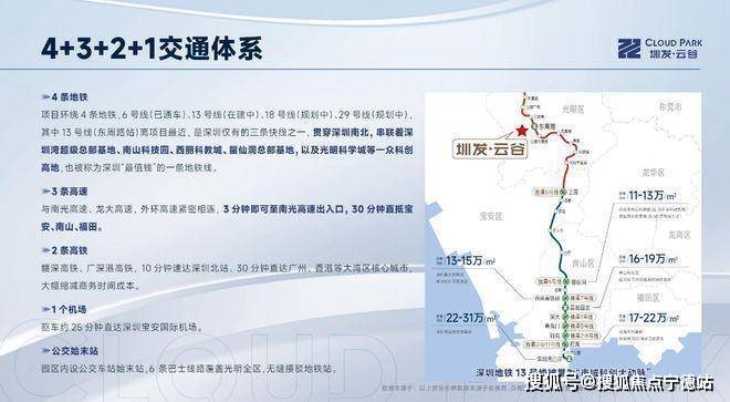 项目环绕4条地铁,6号线(已通车)、13号线(在建中)、18号线(规划中)、29号线(规划中),其中13号线(东周路站)离项目最近,是深圳仅有的三条快线之一,贯穿深圳南北,串联着深圳湾超级总部基地、南山科技园、西丽科教城、留仙洞总部基地,以及光明科学城等一众科创高地,也被称为深圳“最值钱”的一条地铁线。