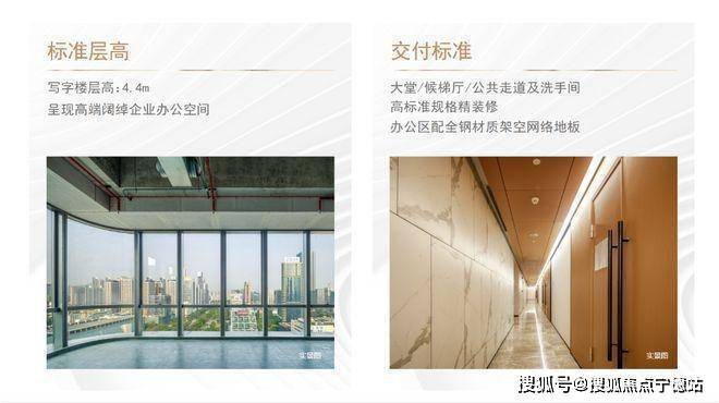 4.4米标准层层高,7-9m进深,办公区配备全钢材质网络地板,方便实用;