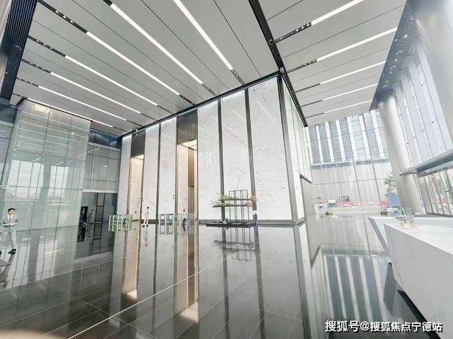 首层大堂:首层主大堂三层挑高,约13.8米,地面铺设大理石,配以铝板及不锈钢天花