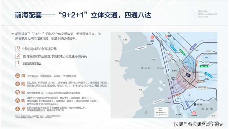海、陆、空、轨,多维立体交通路网辐射粤港澳大湾区,举步即至地铁5/9号线前湾站B口,13分钟直达深圳湾口岸,22分钟左右直抵宝安国际机场,以高效商务咫尺世界。【海】: