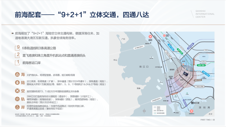 海、陆、空、轨,多维立体交通路网辐射粤港澳大湾区,举步即至地铁5/9号线前湾站B口,13分钟直达深圳湾口岸,22分钟左右直抵宝安国际机场,以高效商务咫尺世界。【海】: