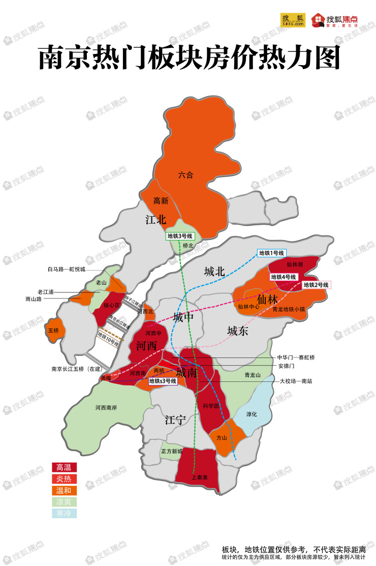 根据买房人关注较多的板块,搜狐焦点重点挑选了江北、河西、城南、江宁、仙林,推出“南京热门板块房价热力图”系列策划选题,展现各个区域的“高温、炎热、温和、凉爽、寒冷”之态,供买房人参考!