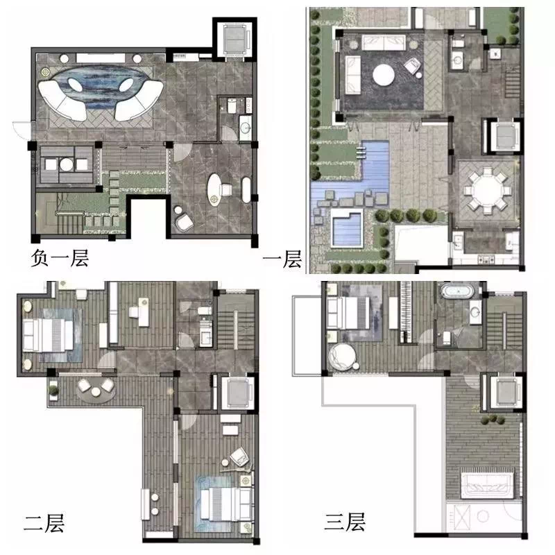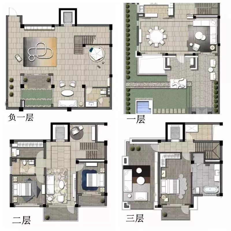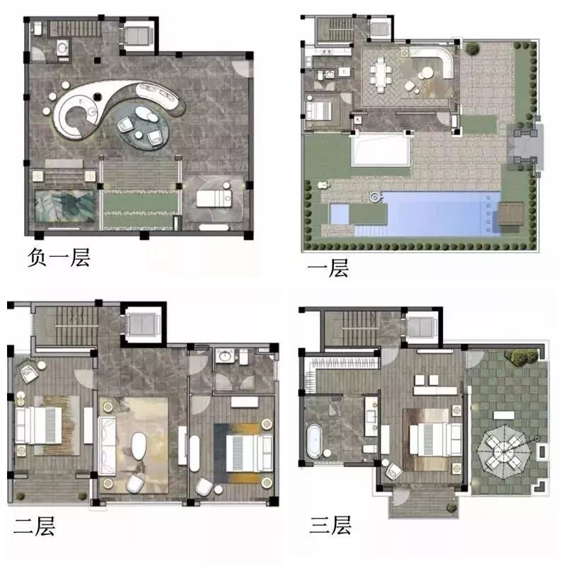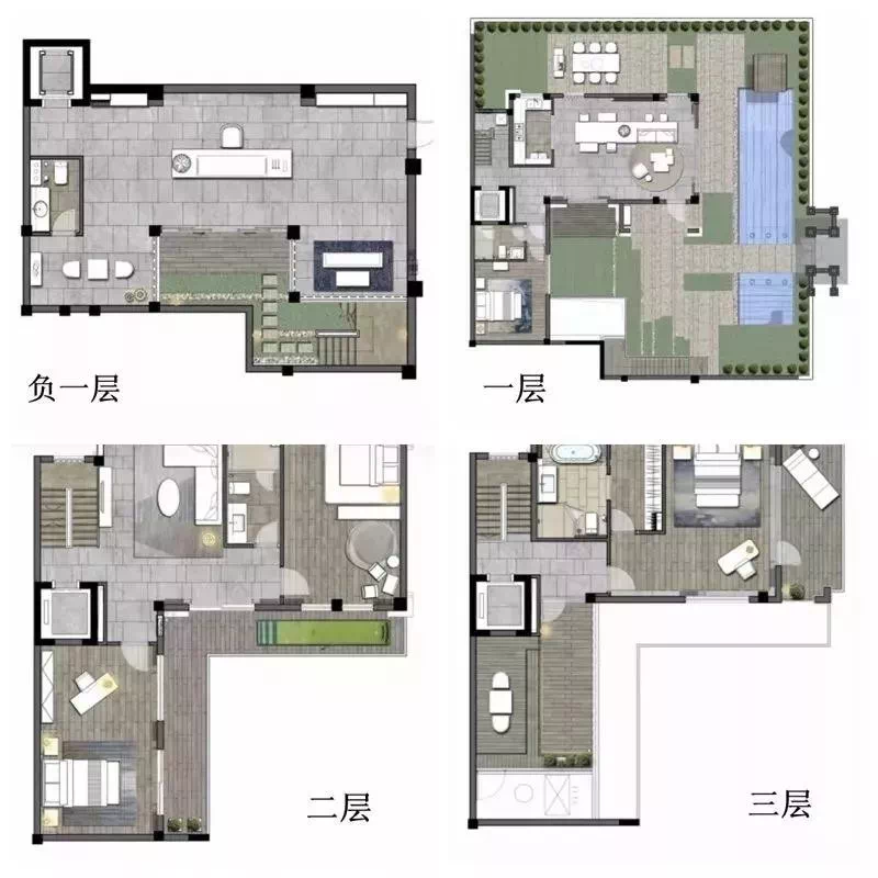 家庭生活区层高3.6米,开间大,采光好,内设温泉泡池;