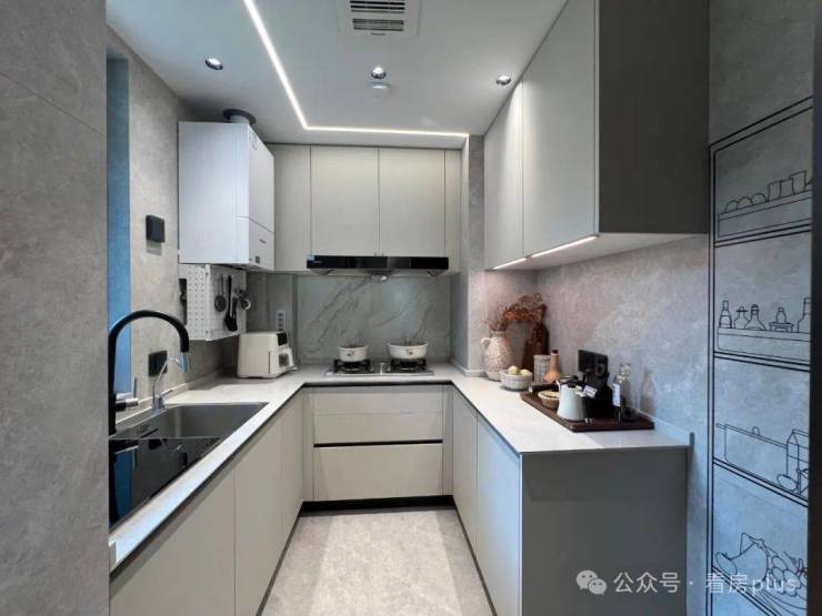 厨房选用镜面拉门,扩大视觉空间,厨卫品牌升级,将水槽龙头也升级为弗兰卡品牌,还增加了垃圾处理器、凉霸。