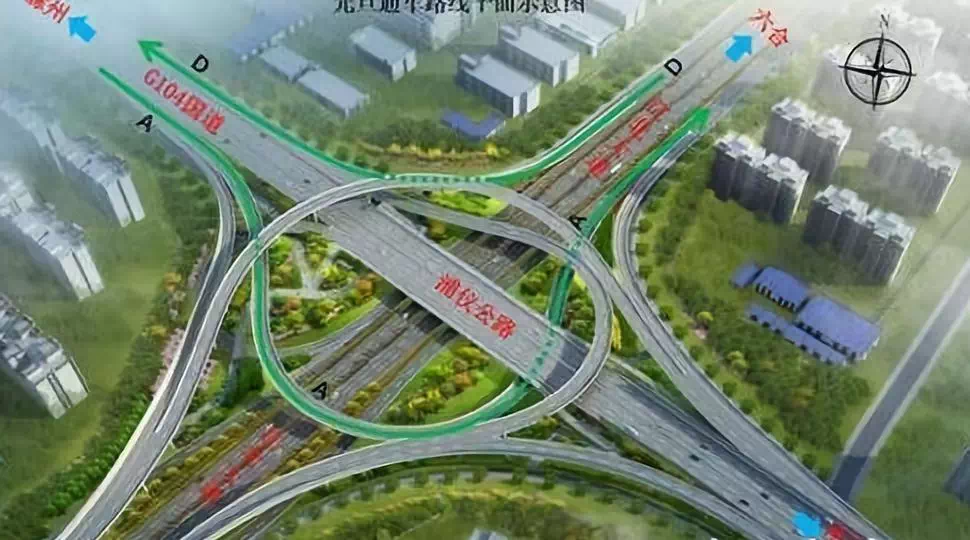 浦仪公路浦泗枢纽位于江北新区G104国道与江北大道交叉处,共计8条匝道,现在通车的是西向北和北向西两个匝道,均为单向双车道。