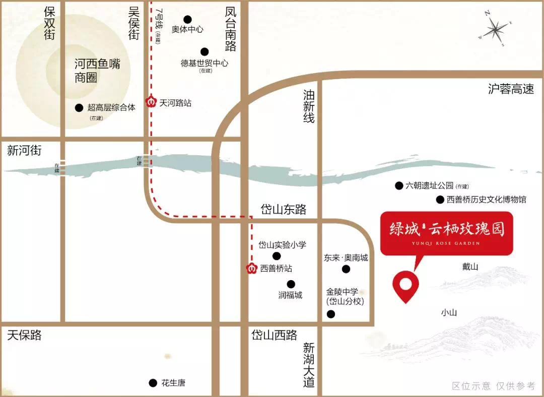 绿城·云栖玫瑰园择址河西南岸,牛首山下,自然环境优渥,一河之隔,可享河西CBD的商业繁华,一路之隔,可享万亩群山风光,在南京过去三年出让的269块土地中,仅此一块容积率为1.2,可谓河西向南的首席低密社区,规划有洋房、叠拼、合庐三种产品形态,建筑风格为现代中式,由参与过杭州凤起潮鸣、杭州江南里等先进中式产品设计的绿城体系中式资深设计师蔣愈带队操刀设计。