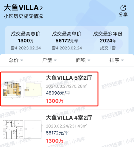 今年3月,复地大鱼也卖出了一套270平的房源,总价1300万,单价4.8万/㎡。