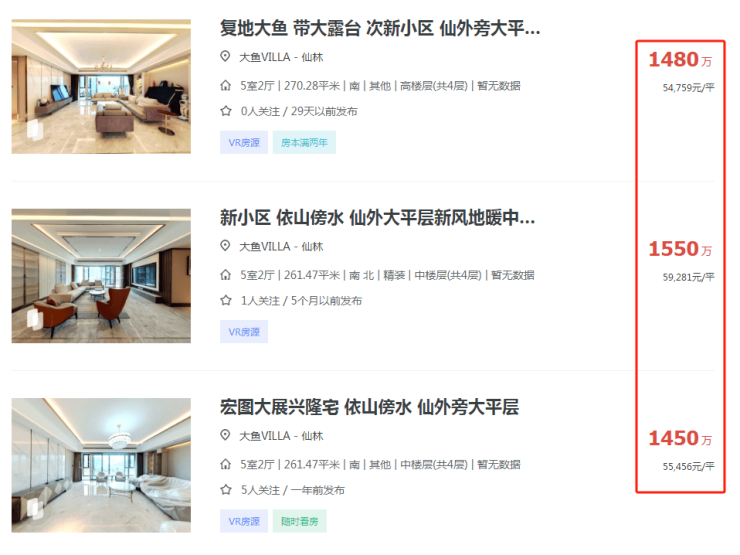 复地大鱼目前挂牌价大多在5.3-5.9万/㎡之间,260㎡的房源总价在1500万左右。