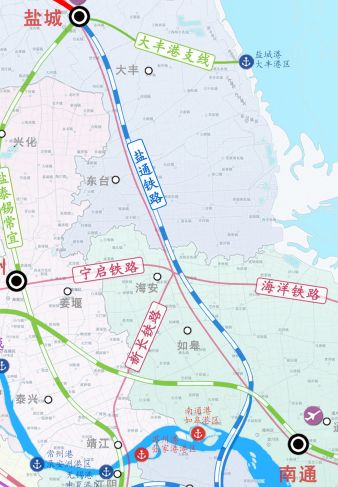 盐通铁路位于盐城、南通境内,沿线设盐城、大丰、东台、海安、如皋南和南通西站,项目全长约157公里,设计时速350公里/时。盐通铁路北连徐盐高铁,南连沪通铁路,建成后将成为徐州至上海之间继京沪高铁之后的又一条快速通道。