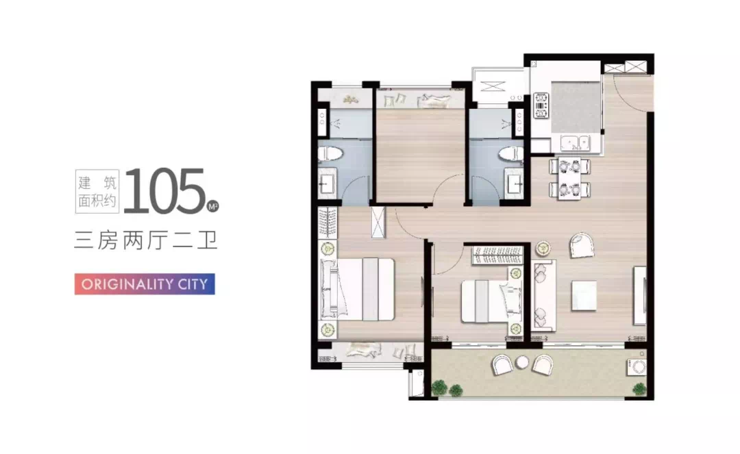 建面约105㎡:三房两厅两卫,拥有6.3米宽阔双阳台,采光充足、主卧套房设计、U形厨房、空间利用合理,适合刚改、改善人群。