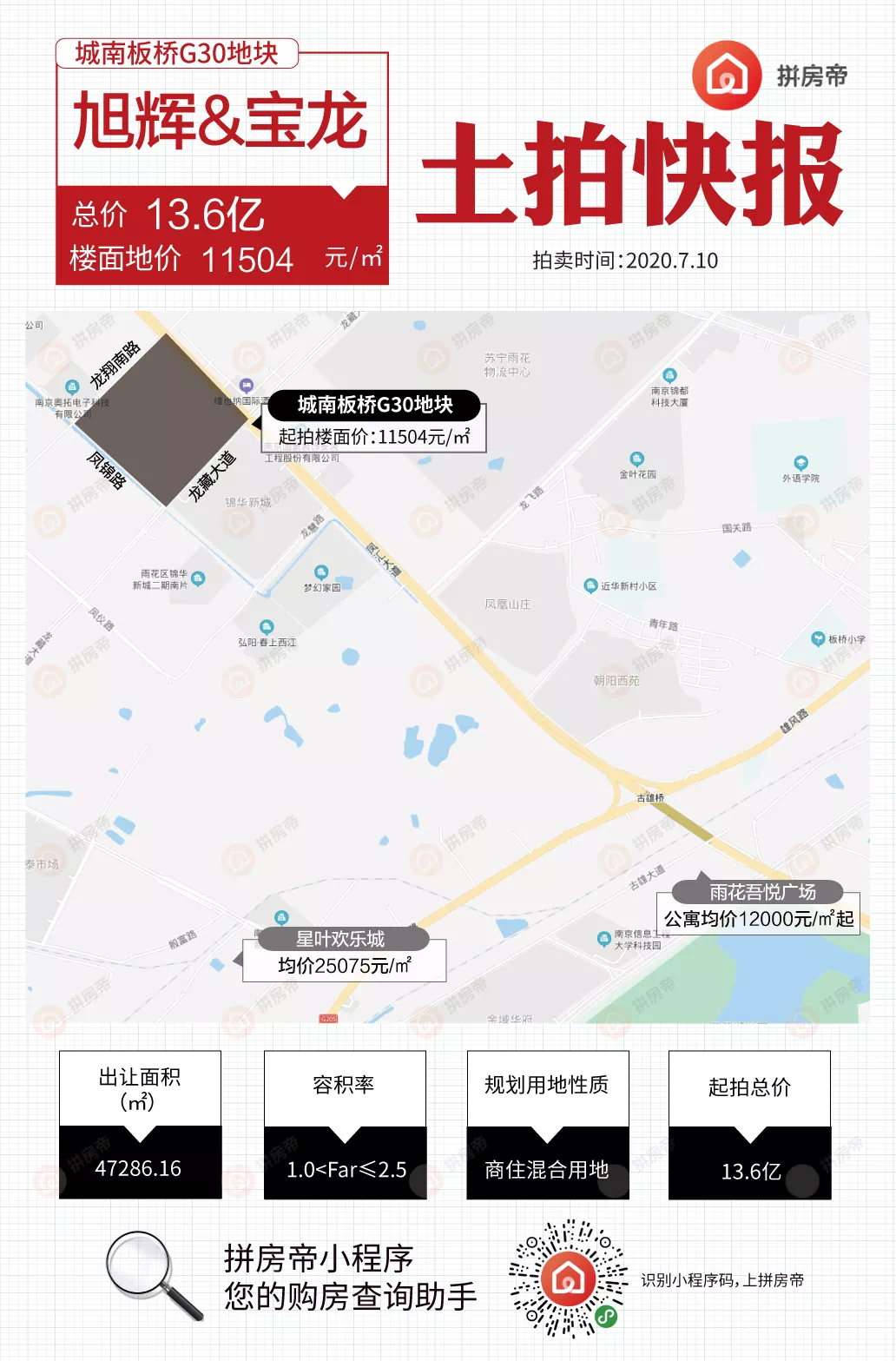 2、板桥G30地块经过1轮竞价,被旭辉&宝龙底价拿下,成交楼面地价11504元/平,未来毛坯房较高限价20000元/㎡。